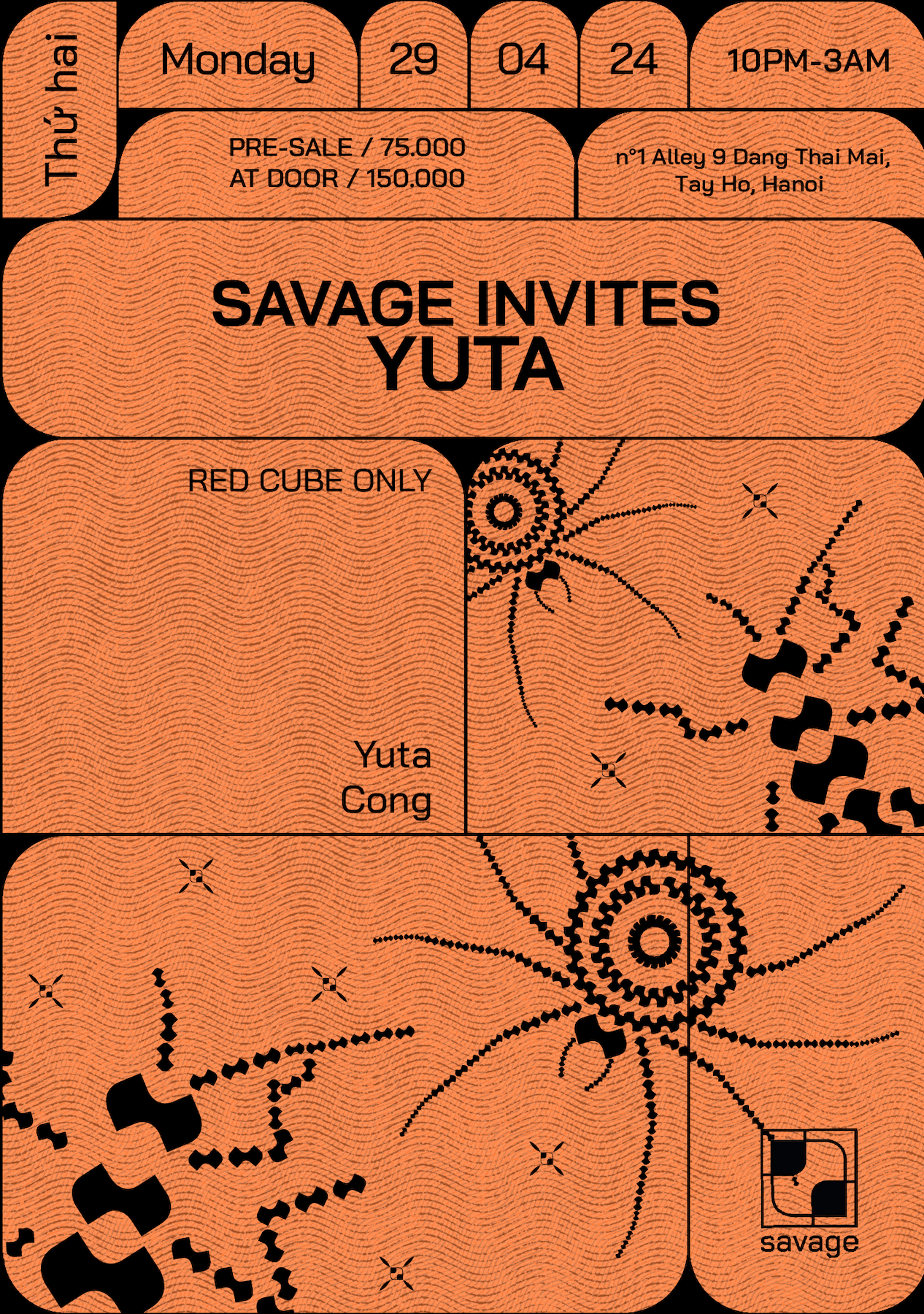 Bậc thầy psychedelic người Nhật Yuta sẽ trở lại Red Cube! Nhà sáng lập của Liquid Drop Groove sẽ mang đến cho các raver một hành trình vượt không gian và thời gian với đặc trưng psychedelic techno của mình, cùng sự hỗ trợ của Savage resident Cong.