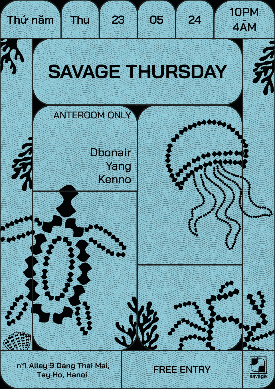Lần này, Anteroom sẽ được quản lý bởi Dbonair, Yang, và Kenno. Với thật nhiều sắc màu âm nhạc và good vibe, bạn chắc chắn sẽ cảm thấy thoải mái tại Savage, dù bạn là ai.