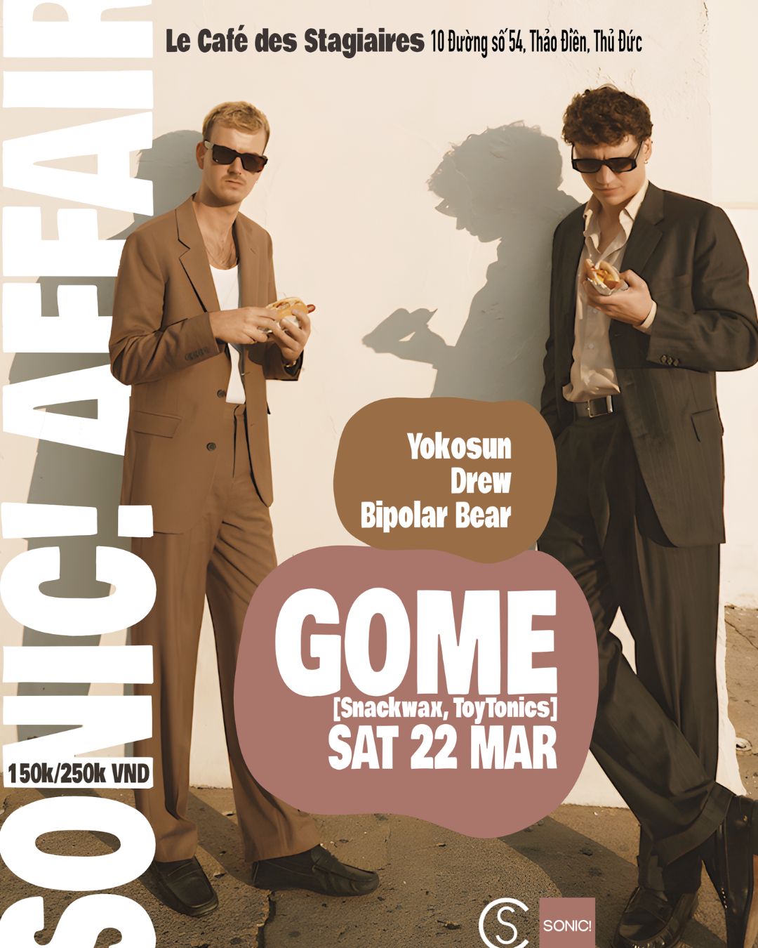 After years of curating top-tier parties along the Central Coast, Sonic! finally lands in Saigon—bringing gome for an exclusive night of groove-heavy, high-energy house music.. This Hamburg-based duo has solidified their place in the electronic music circuit with their raw, energetic house sound, infused with funk, soul, disco, and a touch of punk attitude.