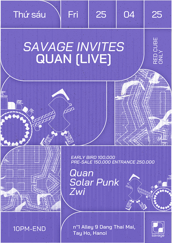 Là một resident của Savage từ những ngày đầu tiên, cái tên của Quan được biết đến với những live set sử dụng synthesizer, đặc biệt khi anh xuất hiện với tư cách nghệ sĩ Việt Nam đầu tiên trên Boiler Room. Chuyển tới Montreal không lâu sau đó, Quan tiếp tục trau dồi chuyên môn thiết kế và phát triển các hệ modular synth, đồng thời tinh chế âm thanh đặc trưng của mình, dẫn đến những màn biểu diễn live đặc sắc tại MUTEK hay Berghain trong những năm gần đây. Trở lại Red Cube vào đêm thứ 6, Quan cùng Solar Punk và Savage resident Zwi sẽ đắm chìm sàn nhạc trong một không gian minimal techno.