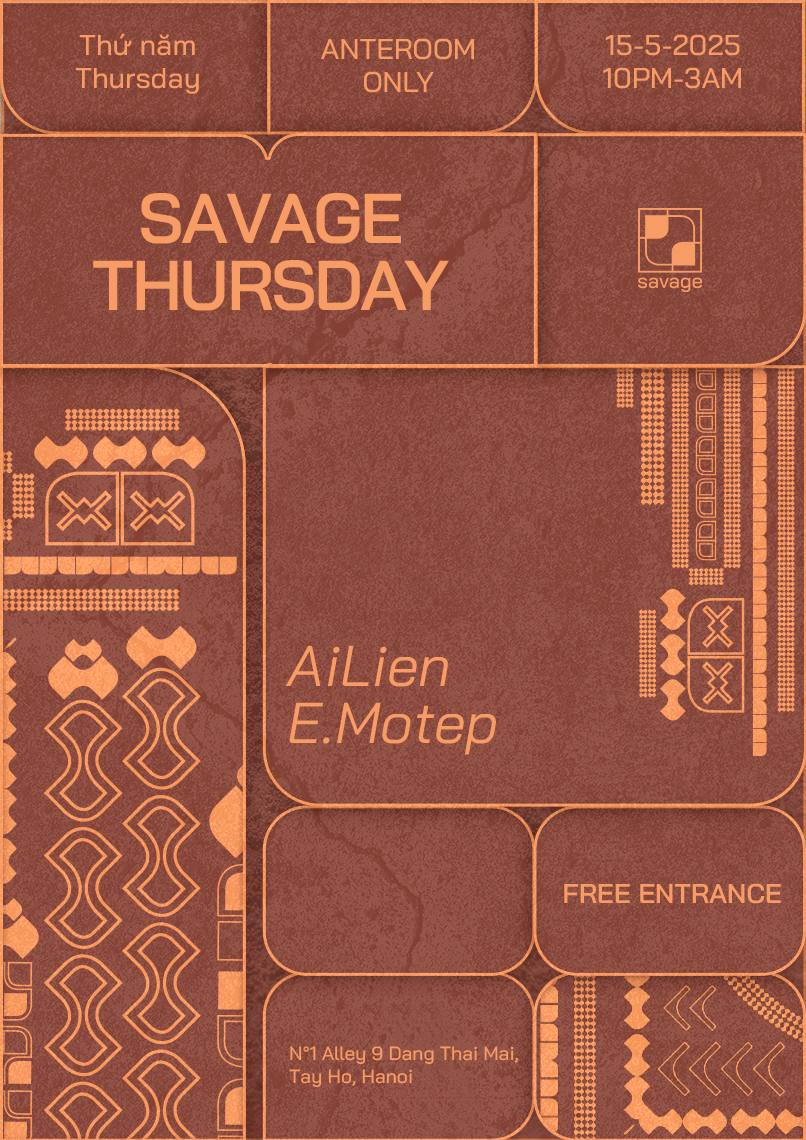 Tới Savage, cùng tránh cái nắng đầu hè với Savage Thursday. Tuần này, hãy dịu lại và cùng vibe với những chuyển động electronic từ AiLien và E.Motep tại Anteroom, và cùng nhau thả lỏng giữa tuần làm việc căng thẳng nhé.