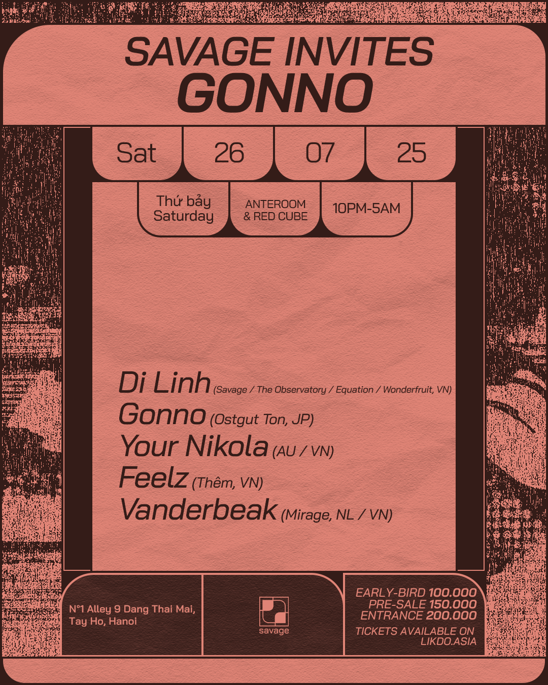 Là một tay nhạc quan trọng trong làn sóng house và techno đương đại Nhật Bản, các set nhạc tràn ngập tính acid và lối kể chuyện cuốn hút của Gonno đã mê hoặc các sàn nhảy quanh thế giới hơn hai thập kỉ qua. Hơn nữa, các sản xuất của anh cũng liên tục xuất hiện cùng các tên tuổi như Laurent Garnier, François Kevorkian, hay Todd Terje. Cộng đồng Savage chắc hẳn không còn lạ gì với những phép thuật đặc sắc của phù thuỷ Gonno, đặc biệt là set nhạc headline tại (re)treat Festival 2024. Gonno trở lại Red Cube đêm thứ 7 này, với sự hỗ trợ từ Savage resident Di Linh và Your Nikola. Cùng lúc đó, Feelz và Vanderbeak sẽ dẫn lối sàn nhạc Anteroom.