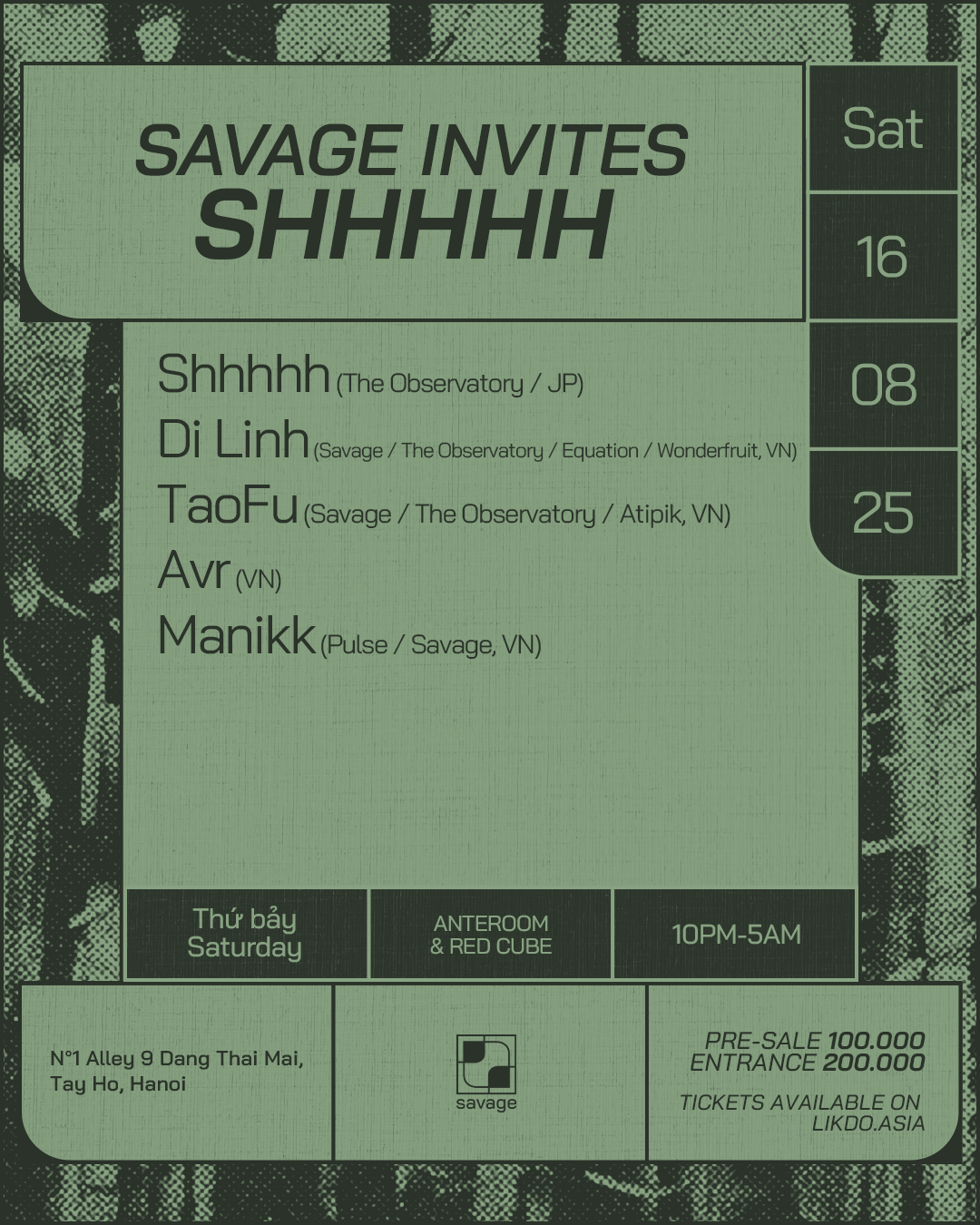 Cái tên DJ Shhhhh nổi lên với một tầm nhìn âm thanh độc đáo, khám phá world music qua lăng kính điện tử của tương lai. Xuất thân từ nhạc thể nghiệm, DJ người Tokyo này mang đến những lựa chọn đặc sắc cùng khả năng ứng biến đường groove liền mạch và tự nhiên. Shhhhh còn đề cao sự kết nối giao thoa văn hóa qua các sóng nhạc toàn cầu như Worldwide FM và NTS Radio, và đáng chú ý là residency lâu năm của anh tại The Observatory Saigon. Thứ Bảy này, DJ Shhhhh sẽ headline Red Cube với sự hỗ trợ từ Savage resident TaoFu và Di Linh; cùng lúc đó, Avr và Manikk sẽ quản lý đêm nhạc Anteroom.