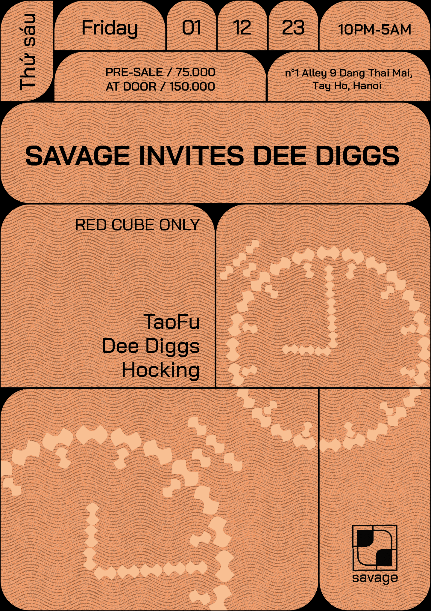 Sinh ra trong thời hoàng kim của House tại Mỹ những năm 90, Dee Diggs luôn mang cội nguồn và tinh thần văn hoá club Mỹ tới mọi sân khấu, thể hiện tình yêu của mình với những người da đen và queer khởi nguồn nên giới party này. DJ người Brooklyn trải lòng bằng những lựa chọn tinh tế nhất, xây dựng những tự sự đầy cảm xúc và kịch nghệ và làm mê đắm nhiều sàn nhảy khắp đất Hoa Kì. Với những bản nhạc có lời, những club edit gợi tình, và những lối chơi nhạc từ tâm hồn, cô đã được góp mặt trong bảng xếp hạng Best Mixes của Resident Advisor và Pitchfork từ những năm đầu sự nghiệp. Mang tình yêu của mình sang châu Á, Dee Diggs sẽ dừng chân tại Red Cube cùng với Hocking và Savage resident TaoFu.